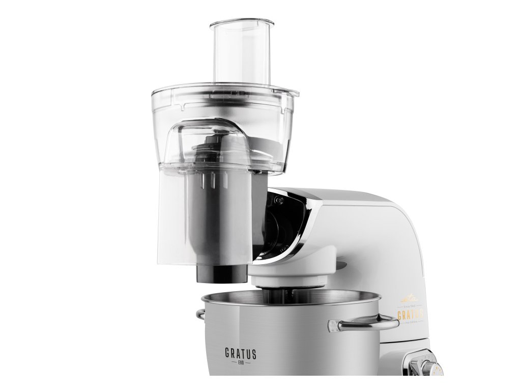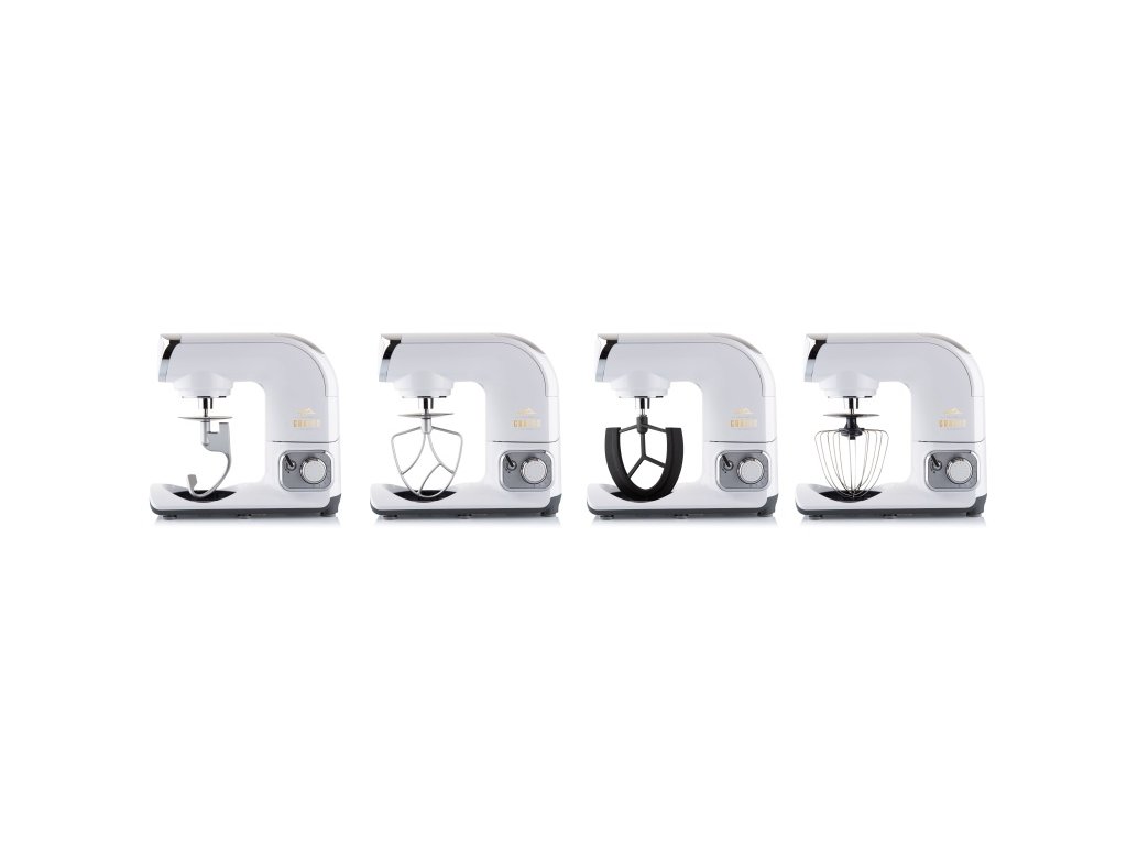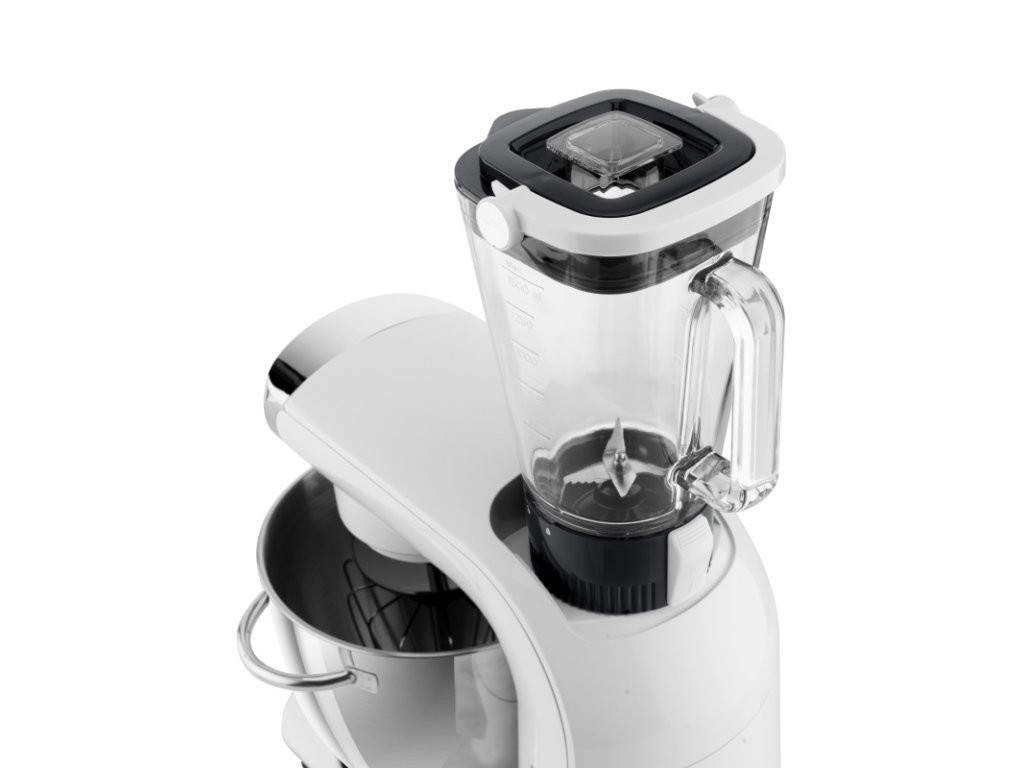 PRÍSLUŠENSTVO: nerezová misa 5,5 l s priehľadným krytom, sklenený mixér 1,5 l, hnetací hák, metla na šľahanie, miešacia metla, flexi metla (na krémy a ľahké cestá), nadstavec na strúhanie s 3 celonerezovými diskovými strúhadlami, mlynček na mäso o priemere 62 mm, 3x mlecie doštičky, nadstavec na výrobu údenín, nadstavec na výrobu mäsových trubičiek Kebbe, tvorítko na cukrovinky, vtláčadlo, uvoľňovací kľúč, prevodovka • farba: biela