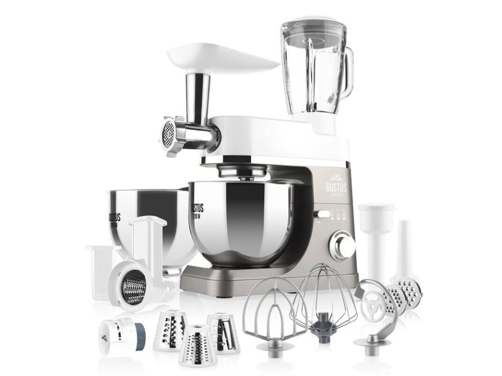 PRÍSLUŠENSTVO: 2x nerezová misa 5,5 l , sklenený mixér 1,5 l, hnetací hák, metla na šľahanie, miešacia metla, nadstavec na strúhanie so 4 bubienkovými strúhadlami, mlynček na mäso o priemere 54 mm, 3 veľkosti mlecích doštičiek, nadstavec na výrobu údenín, brúska na nože • farba: biela/sivá.