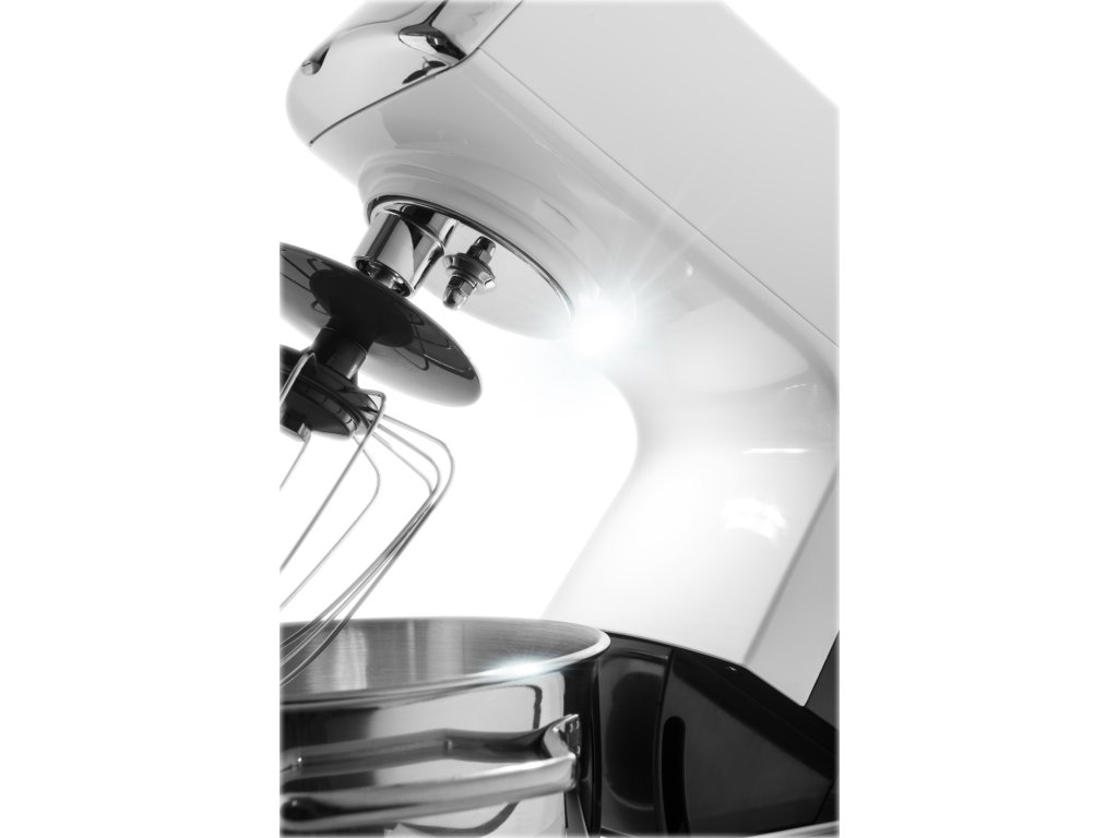 PRÍSLUŠENSTVO: nerezová misa 6,7 l s priehľadným krytom, nerezová misa o objeme 3,5 l s vekom na uskladnenie, sklenený mixér 1,5 l s vtláčadlom, hnetací hák, metla na šľahanie, miešacia metla, flexi metla (na krémy a ľahké cestá), nadstavec na strúhanie s 3 diskovými strúhadlami, mlynček na mäso o priemere 62 mm, 3x mlecie doštičky, nerezový nadstavec na výrobu údenín, nadstavec na výrobu Kebbe, tvorítko na cukrovinky, prevodovka, uvoľňovací kľúč, čistiaci nástroj, praktický obal na metly a strúhadlá • dĺžka kábla 1,2 m • farba: biela
