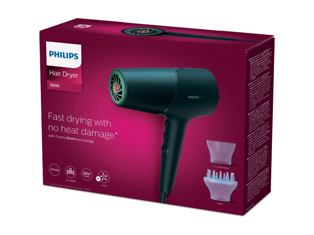 Susic vlasov Hair Dryer Series 5000, 2300W (DC motor) so siestimi flexibilnymi nastaveniami rychlosti a teploty pre dokonalu kontrolu. Senzor ThermoShield. Technologia Cool Shot na zafixovanie ucesu po vysuseni. Ionizacna starostlivost (4x viac Ionov) pre dokonale hladke a leskle vlasy. Masazny objemovy difuzer zvacsuje objem, vytvara kadere a pruzne ucesy. Uzka koncovka pre koncentraciu tepleho vzduchu a dokonalu upravu vlasov. Dlzka kabla:1,8 m. Hacik pre pohodlne skladovanie.Dodatočné parametre