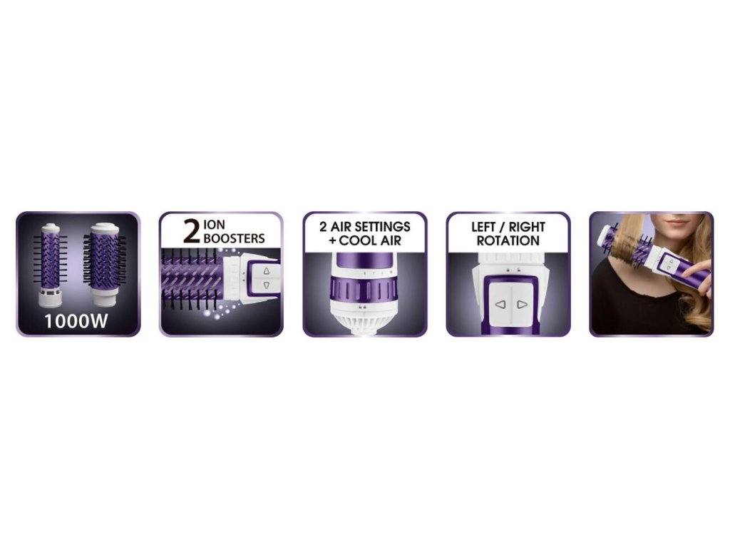 Kulmofén - ROWENTA CF9530F0, výkonný generátor iónov s 2 zosilovačmi vytvára až 40x viac iónov pre maximálny objem a lesk, ríkon 1000 W pre rýchle a profesionálne súčasné vysušenie, keramický povrch chráni povrch vlasov, 2 druhy kief (priemer 5 cm a 3 cm) pre optimálnu účinnosť pri všetkých dĺžkach vlasov, 2 smery otáčania: vľavo a vpravo, 2 stupne nastavenia teploty + studený vzduch, ochranný kryt pre obe vymeniteľné kefy
