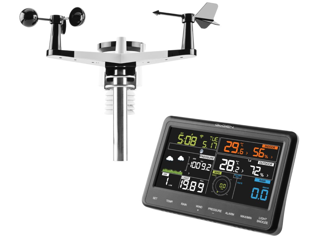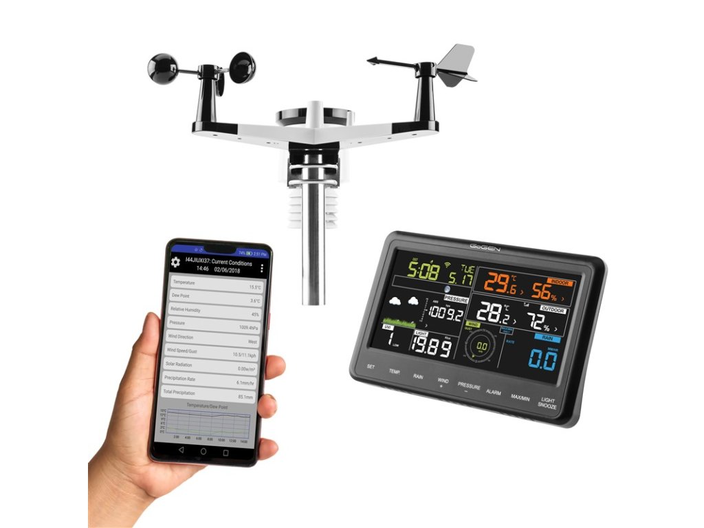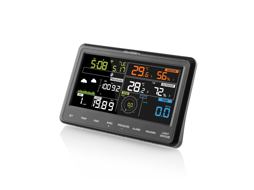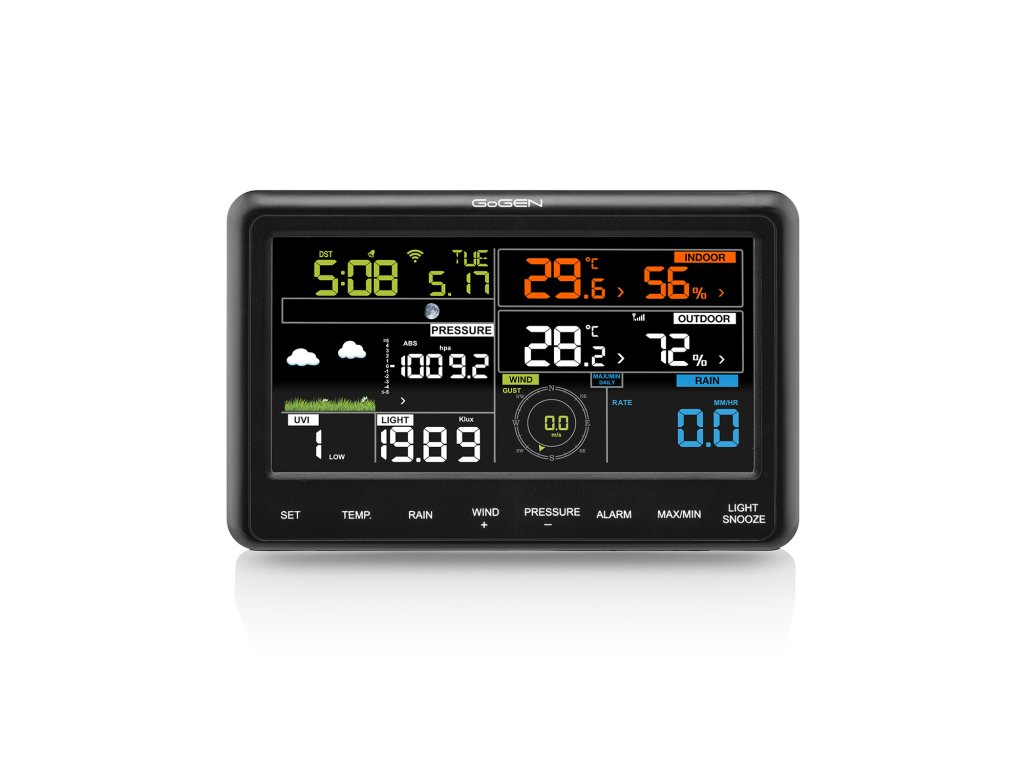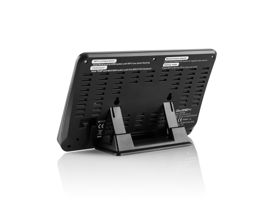 GoGENME3900 , profesionálna meteostanica, GoGEN ME3900, farebný displej, bezdrôtový senzor , farebný LCD displej , čas riadený rádiovým signálom , bezdrôtové vonkajšie čidlo , predpoveď počasia s animáciou , barometrický tlak , vnútorná teplota: -10 °C až +60 °C , vonkajšia teplota: -40 °C až +60 °C , vlhkosť vzduchu (vnútorná, vonkajšia): 10 % až +99 % , rýchlosť vetra , smer vetra , zrážky , UV index , dátum, čas , funkcia budíka , fázy Mesiaca , WiFi, prenos dát do mobilnej aplikácie, predpoveď počasia z internetových dát , napájanie: hlavná jednotka - adaptérom alebo 3x batérie AAA, teplotný senzor - 2 x batérie AA , farba: čierna , záruka 4 rokyDodatočné parametre