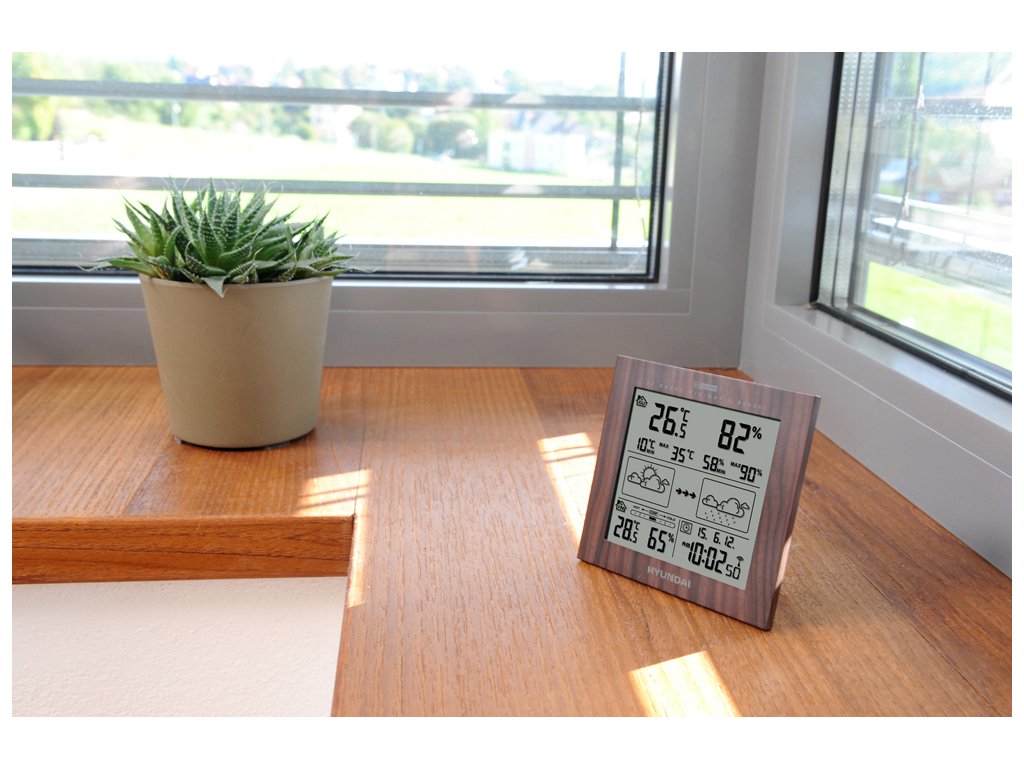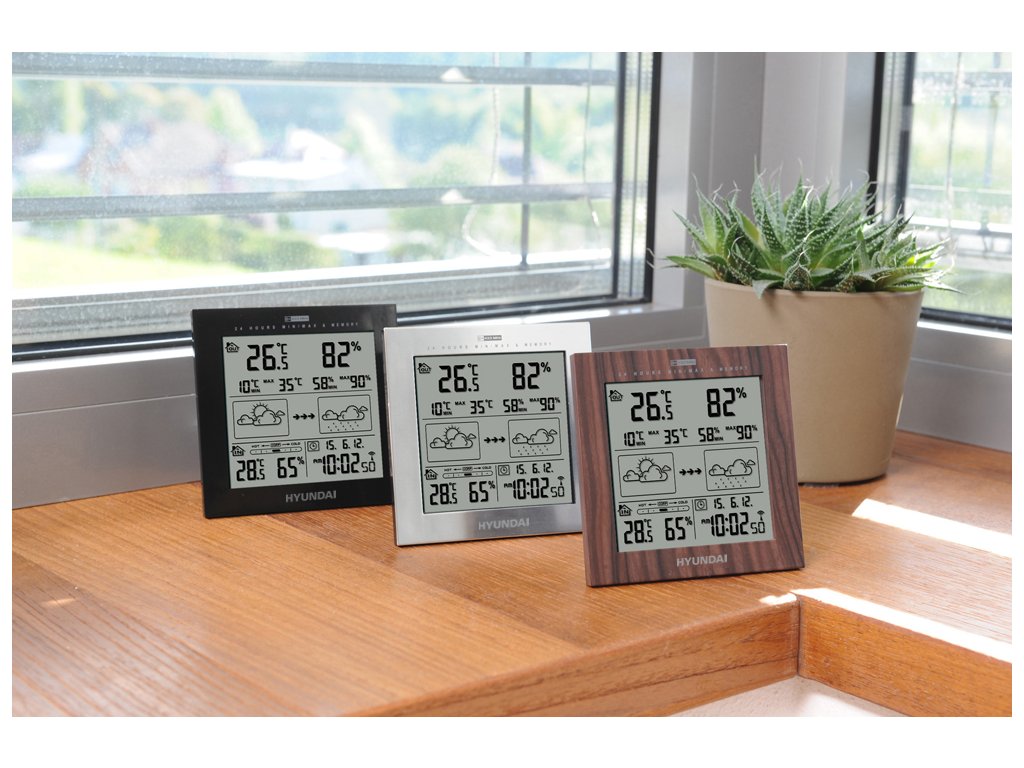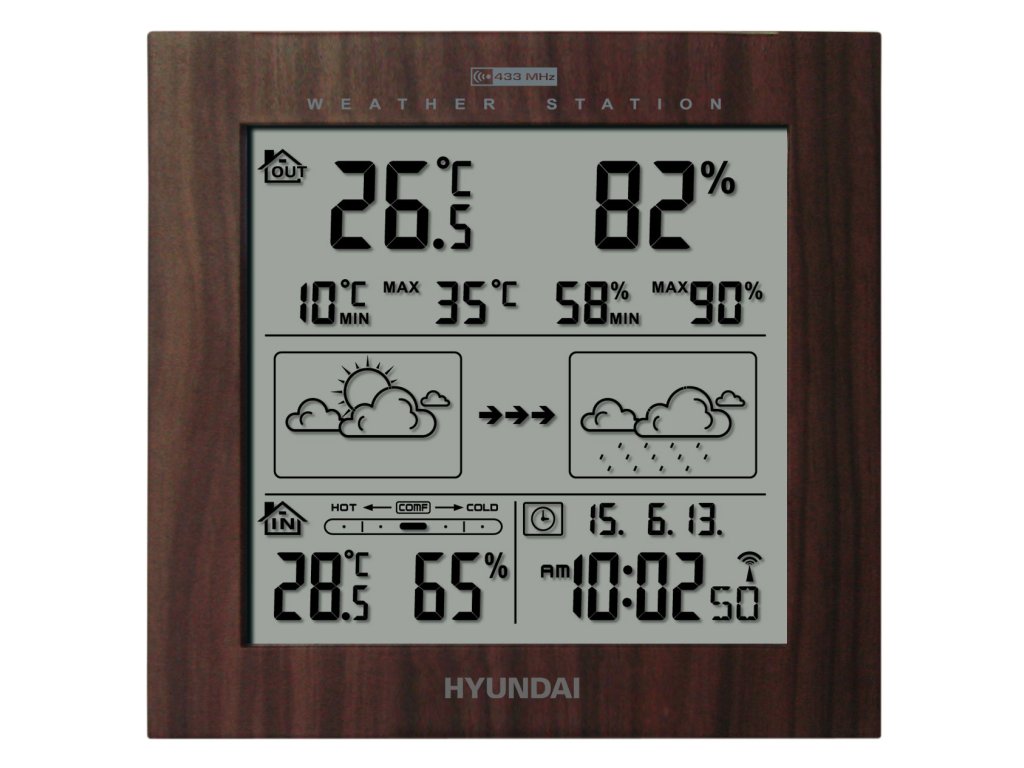 HyundaiWS2244W • Meteostanica, Hyundai WS2244W, prehľadný displej, bezdrôtový senzor • Comfort index - ukazovateľ optimálneho prostredia , predpoveď počasia s animáciou , vnútorná teplota: -10°C až +50°C , vonkajšia teplota: -20°C až +50°C , vnútorná a vonkajšia vlhkosť vzduchu: 20% až 99% , max. a min. vonkajšej teploty , max. a min. vonkajšej vlhkosti vzduchu , alarm pre vonkajšiu teplotu , kalendár, budík , napájanie: hlavná jednotka 3 x 1,5 V / AAA; jednotka teplotného senzoru - 2 x 1,5 V / AAA , farba: imitácia dreva , záruka 40 mesiacovDodatočné parametre