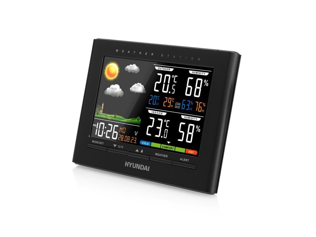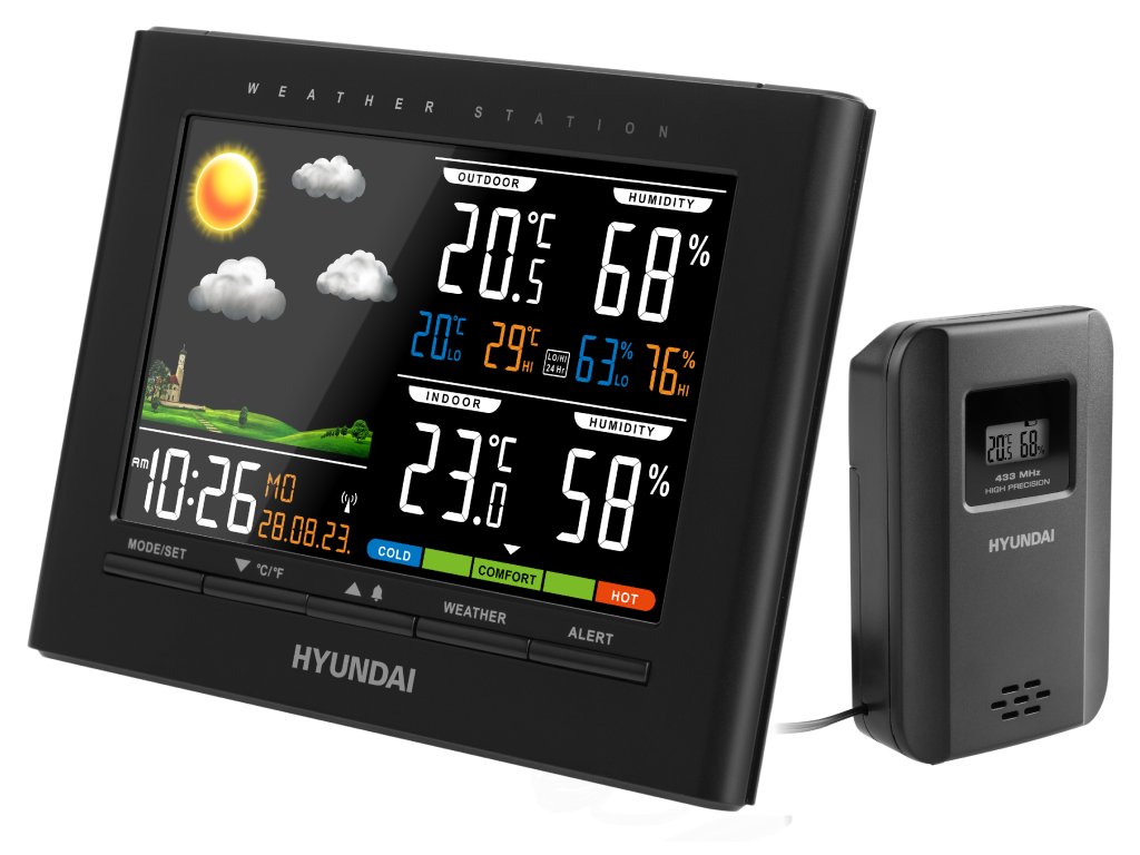 HyundaiWS4380 , meteostanica, Hyundai WS4380, farebný displej, bezdrôtový senzor , farebný displej s nastaviteľnou intenzitou podsvietenia , prenos dát zo senzoru na frekvencii 433 MHz , predpoveď počasia s animáciou , vnútorná teplota: -9,9 °C až +50 °C , vonkajšia teplota: -20 °C až +50 °C , vlhkosť vzduchu: 20 % až 99 % , budík , kalendár , napájanie: hlavná jednotka - 2 x 1,5 V / AA, teplotný senzor - 2 x 1,5 V / AA, batérie nie sú súčasťou balenia , farba: čierna , záruka 40 mesiacovDodatočné parametre