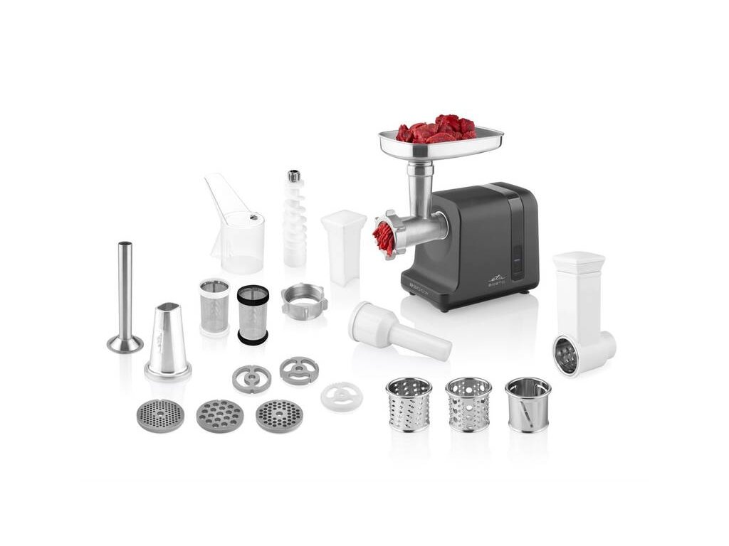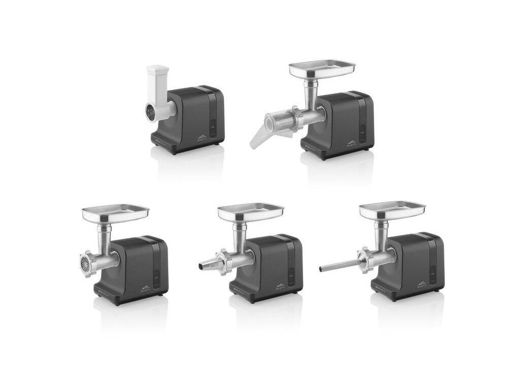 Mlynček na mäso, ETA607590000, Príkon 2500 W • DC motor • rýchlosť mletia až 2,9 kg/min. • funkcia REVERS • kovové telo mlynčeka aj prevodové kolieska • možnosť použitia príslušenstva na kuchynské roboty ETA na výstup na mlynček na mäso • dĺžka kábla 1,3 m • funkcie: mletie, strúhanie, lisovanie, výroba klobás a masti • funkcia REVERSE.