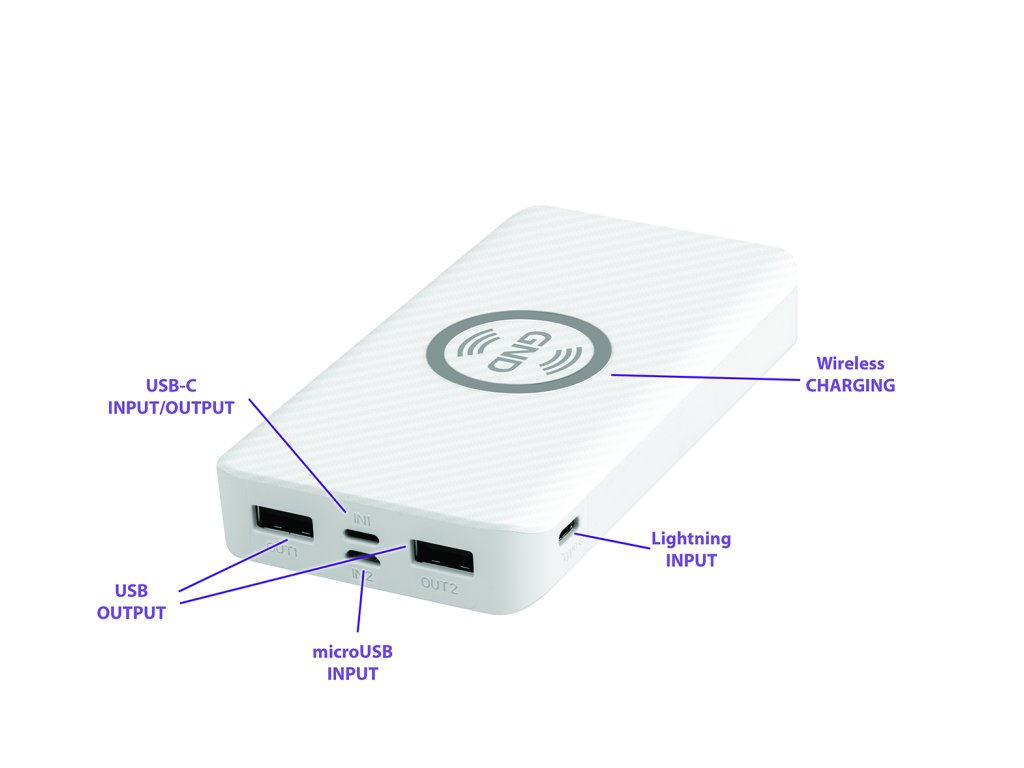 GNDPB100003W • Power banka, GND PB100003W, Li-pól batéria (10.000 mAh) • Li-pol batéria , kapacita 3,7 V - 10 000 mAh / 37 Wh , funkcia bezdrôtového nabíjania , vstupy: Micro USB 5 V / 2 A; Lightning 5 V / 1 A; USB-C 5 V / 2 A , výstup 1: USB 5 V / 2 A , výstup 2: USB 5 V / 1 A , bezdrôtové nabíjanie 5W , LED indikátor stavu nabitia , PRÍSLUŠENSTVO: Micro USB kábel , farba: bielaDodatočné parametre