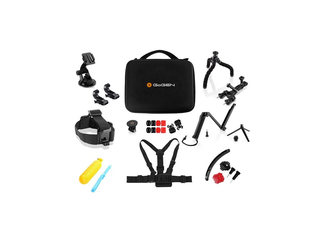 GoGENCAM31ACCKIT • Univerzálna sada držiakov na kamery, GoGEN CAM31ACCKIT • univerzálna pre športové kamery , obsah balenia: držiak na riadidlá, adaptér so stativovým závitom, základný adaptér so sponou (2 kusy), J adaptér so sponou (2 kusy), ploché a zakrivené držiaky a 3M nálepky (4 + 4 kusy), prísavka, rameno s držiakom na prilbu, univerzálny flexibilný tripod, skladací monopod s tripodom, držiak s pútkom, popruh na hlavu, popruh na hrudník, taška , farba: čierna
