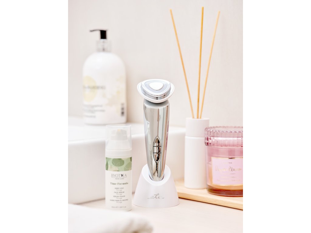 ETA635390000SET • Galvanická žehlička na tvár, ETA 635390000SET, komplexné ošetrenie pleti • Li-ion akumulátor 3,7 V , doba nabíjania 2,5 hod. , doba prevádzky 4 hod. , multifunkčný prístroj na komplexné ošetrenie pleti , stimuluje syntézu kolagénu, elastinu a kyseliny hyalurónovej , fotónová terapia (červené svetlo aktivuje kolagén, modré svetlo upokojuje pokožku a pôsobí protizápalovo) , technológia galvanického prúdu (kladná ionizácia na hĺbkové čistenie, záporná ionizácia na hĺbkovú aplikáciu kozmetických prípravkov) , 5 režimov prevádzky , regulácia teploty a intenzity , dobíjanie cez mikro USB kábel , PRÍSLUŠENSTVO: Sérum Byotea TIME FORMULA proti prvým vráskam 30ml, odkladací stojan, USB kábel , farba: biela/strieborná