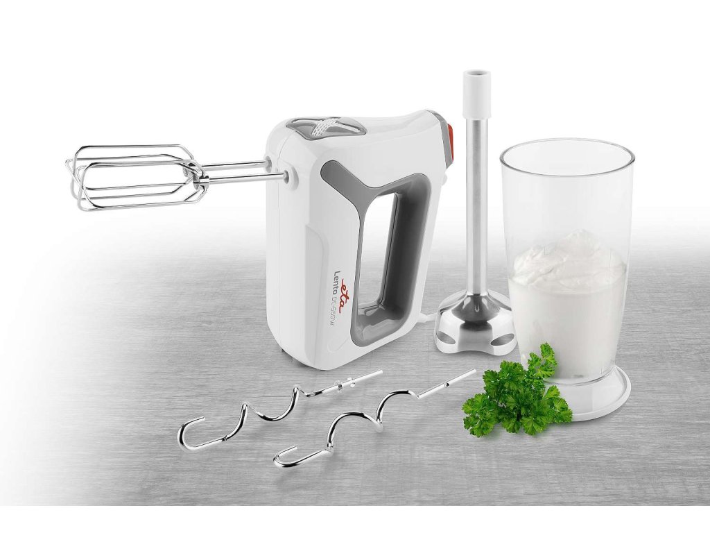 ETA105190000 • ručný šľahač, ETA 105190000, 4 rýchlostné stupne • príkon 550 W , DC motor , 4 rýchlostné stupne , PRÍSLUŠENSTVO: 2 metly na šľahanie a 2 hnetacie háky, nerezový tyčový mixér, pracovná nádoba o objeme 800 ml , dĺžka napájacieho kábla 1,2 m , farba: biela