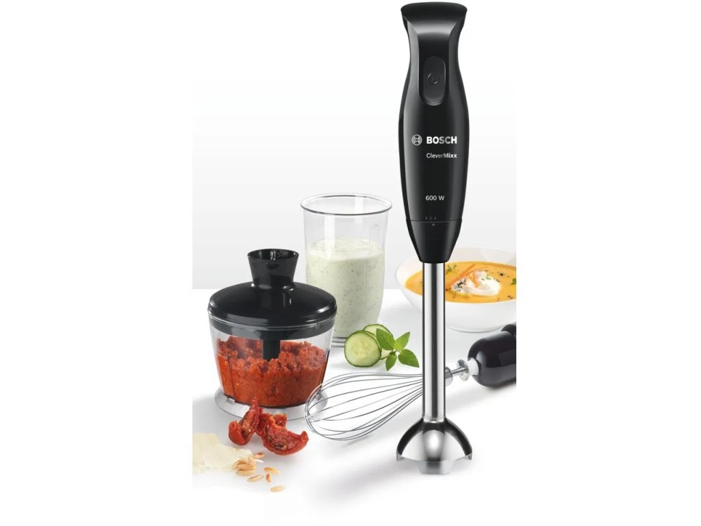 Tyčový mixér – BOSCH MSM2650B CleverMixx, príkon 600 W, 1 rýchlosť, nadstavce vhodné do umývačky, funkcie: sekanie, šľahanie, mixovanie a vákuovanie, 4 nože, sekáčik so sekacou nádobou, mixovacia nádoba, šľahacia metla a úzka mixovacia noha súčasťou balenia, materiál nohy nerezDodatočné parametre