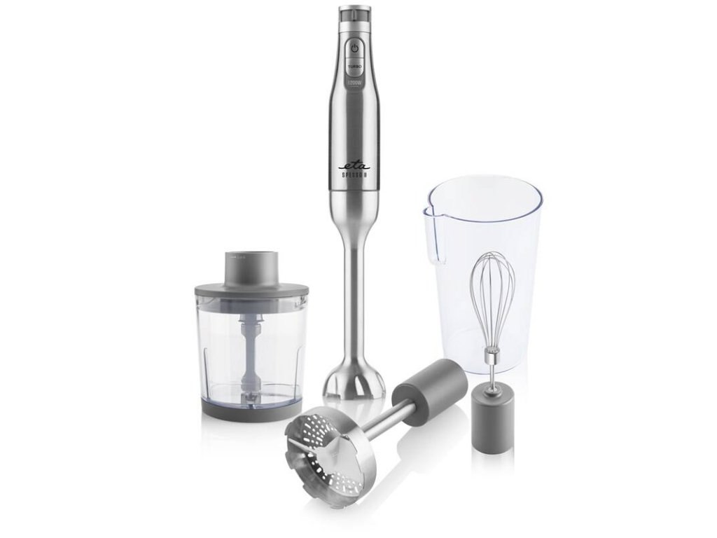 Tyčový mixér s príslušenstvom, ETA421590000, Príkon 1200 W • DC motor • plynulá regulácia otáčok • TURBO.PRÍSLUŠENSTVO: nerezový tyčový mixér, metla na šľahanie, sekáčik potravín (500 ml) s kosákovitým nerezovým nožom, pracovná nádoba (600 ml), špeciálny nadstavec na zemiaky a prípravu zeleninových pyré • farba: nerez/sivá