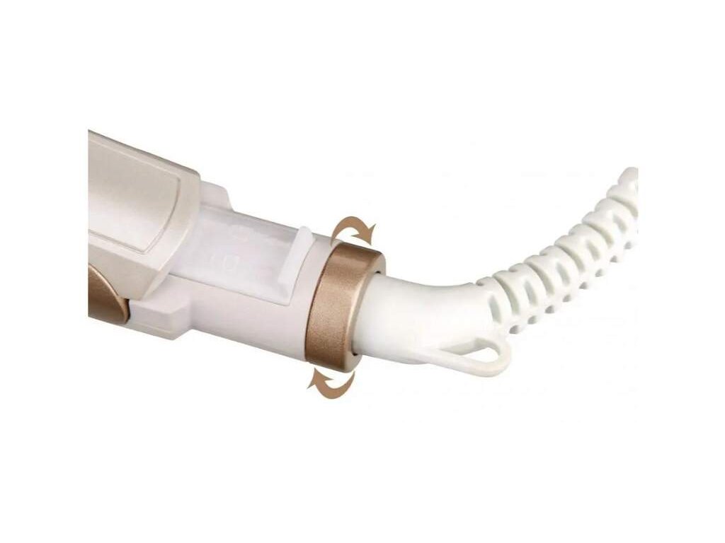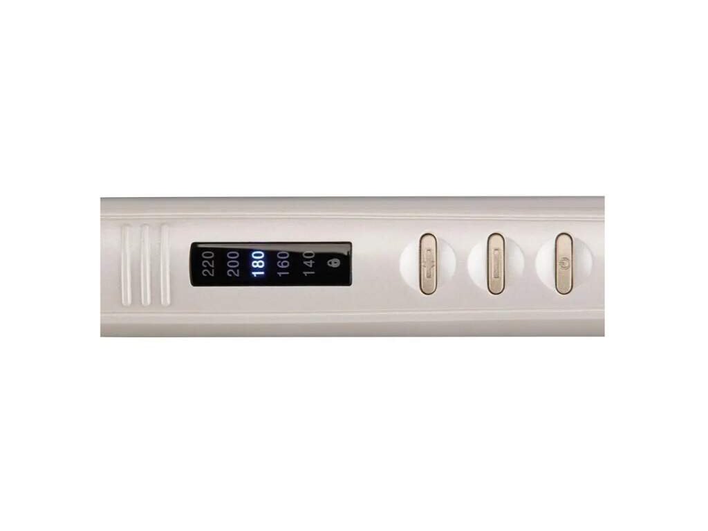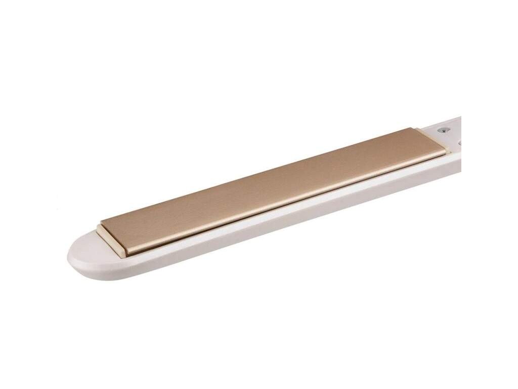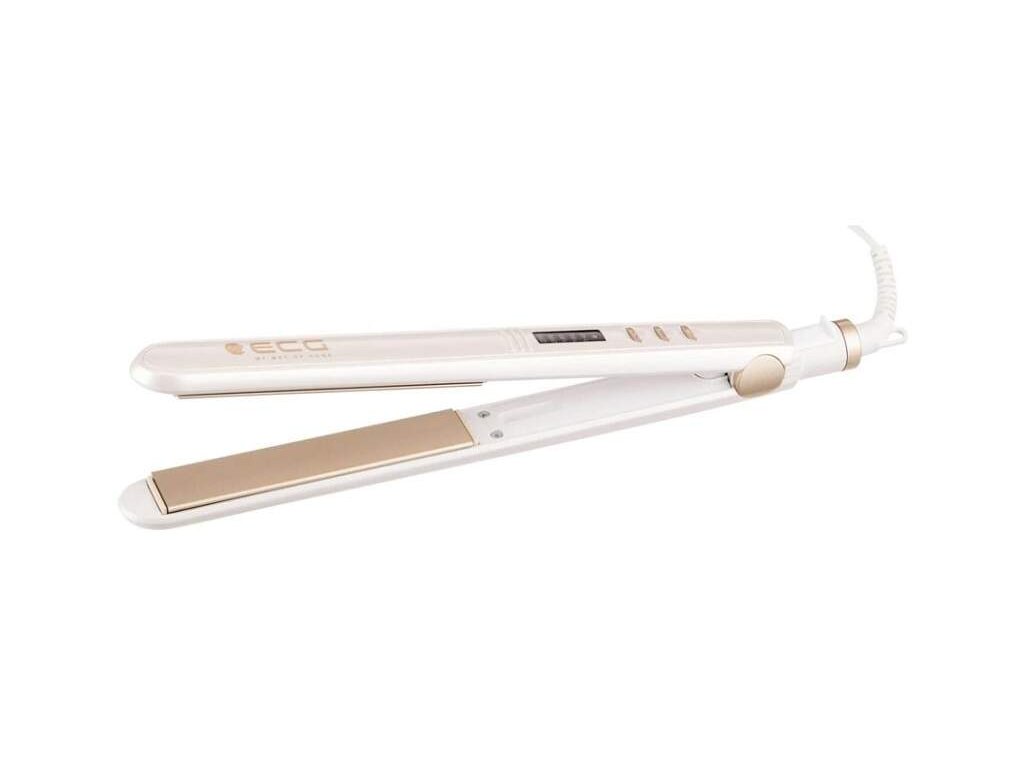 Žehlička na vlasy – ECG ZV 117, keramický povrch doštičiek, 5 teplotných stupňov, rozsah teploty od 140 do 220 °C, rýchle nahrievanie, automatické vypnutie, plávajúce žehliace dosky, regulácia teploty, svetelná signalizácia, podsvietený displej, príkon 40 W, dĺžka prívodného kábla 1,7 m, biela a zlatá farba, bezpečnostný zámok, flexibilný kábel a plávajúce žehliace dosky, sieťové napájanieDodatočné parametre