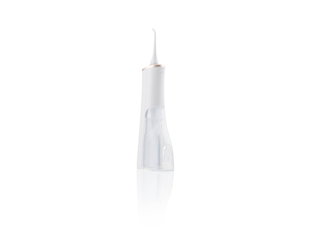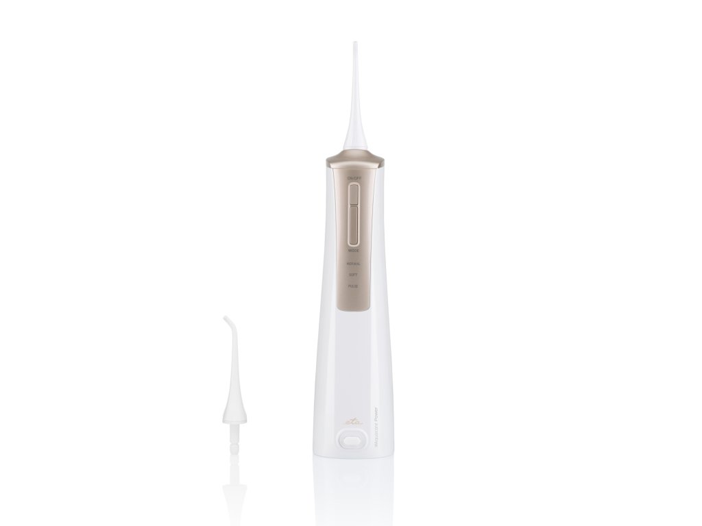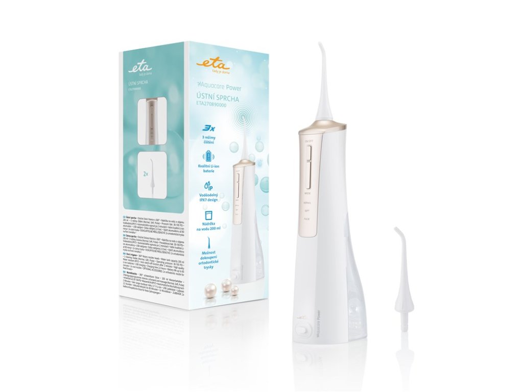 ETA270890000 • ústna sprcha, ETA 270890000, na čistenie chrupu a medzizubných priestorov • na čistenie chrupu a medzizubných priestorov , kvalitný Li-ion akumulátor , doba nabíjania 2,5 hod. , výdrž akumulátora až 80 min. , otočné čistiace hlavice o 360° , prevádzkový tlak čerpadla: 2,1 - 6,9 bar , nádržka na vodu o objeme 200 ml , 3 režimy čistenia (Normal, Soft, Pulse) , vypnutie po 2 minútach , svetelná signalizácia nabíjania, nabitia, vybitia, funkcie , krytie IPX7 , PRÍSLUŠENSTVO: mikro USB kábel, tryska 2 ks , farba: biela/zlatá